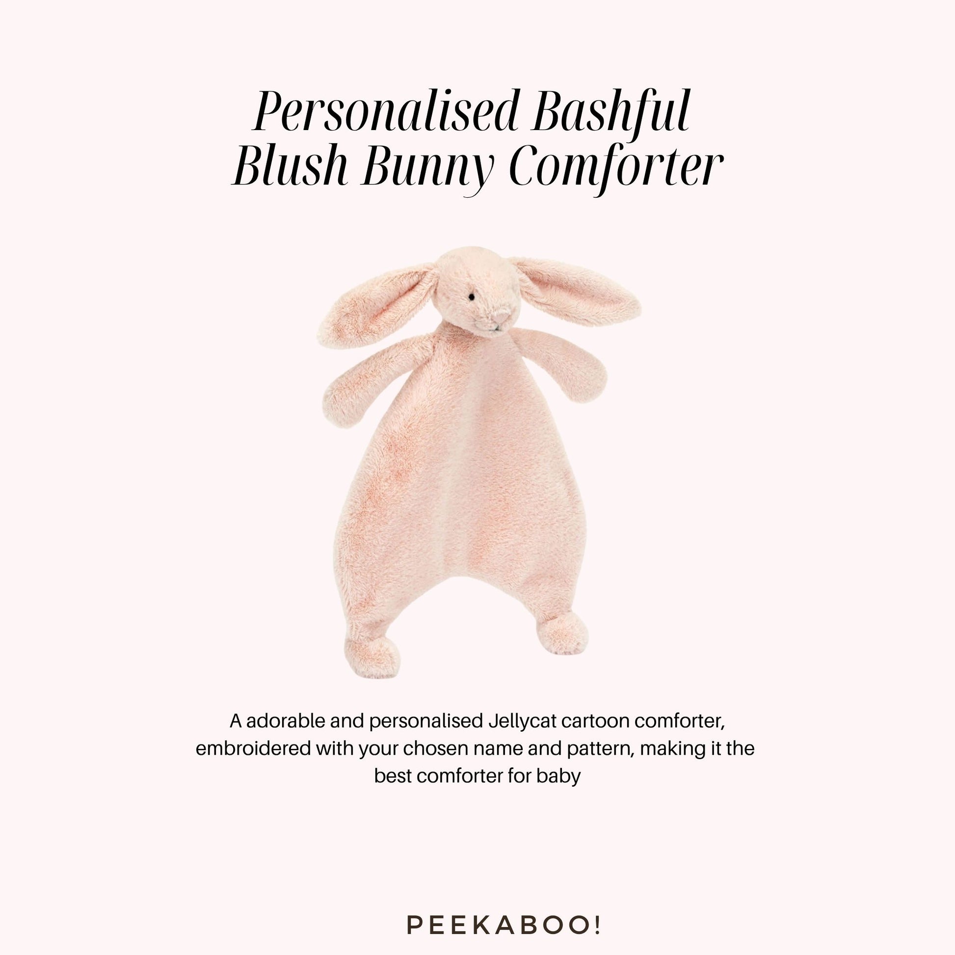 Personalised Jellycat Bashful Blush Bunny Comforter as unique comfort for babies. Customise it with name and cute pattern to make it truly unique. Perfect for newborn, baby birthdays, baby showers, or cherished moments, this comforter combines adorable and personalised design, making it a thoughtful and lasting gift for any occasion.